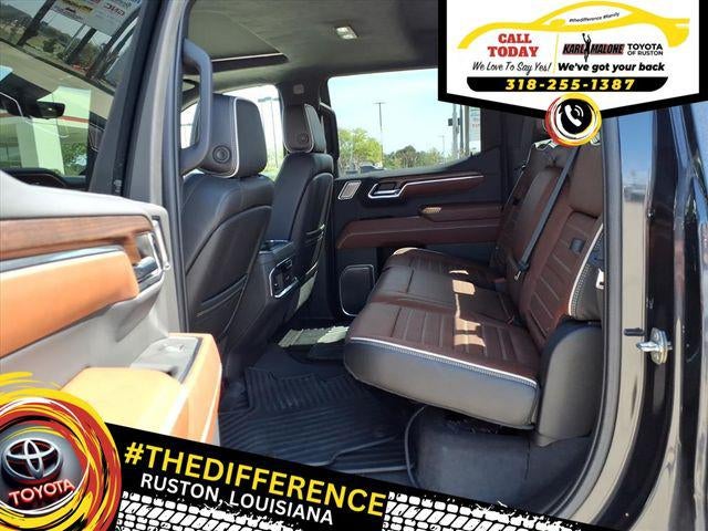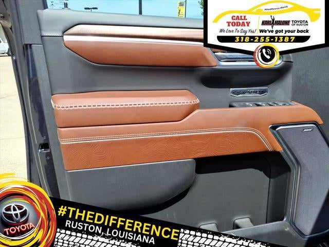 10-Speed Automatic, 4WD, Alpine Umber Leather, 12 Speakers, 120-Volt Bed Mounted Power Outlet, 120-Volt Instrument Panel Power Outlet, 16-Way Power Driver Seat Adjuster w/Lumbar, 16-Way Power Passenger Seat Adjuster w/Lumbar, 170 Amp Alternator, 2 Charge/Data USB Ports Inside Center Console, 2 Type-C Charge-Only Rear USB Ports, 2 USB Ports, 220 Amp Alternator, 3 Years of OnStar Safety & Security, 3.23 Rear Axle Ratio, 4-Wheel Disc Brakes, ABS brakes, Adaptive suspension, Air Conditioning, Alloy wheels, AM/FM radio: SiriusXM with 360L, Apple CarPlay/Android Auto, Auto High-beam Headlights, Auto-dimming door mirrors, Auto-dimming Rear-View mirror, Auto-Locking Rear Differential, Automatic Emergency Braking, Automatic temperature control, Bed View Camera, Bose Premium Series w/12-Speaker System, Brake assist, Buckle to Drive, Bumpers: body-color, Carbon Fiber Composite Bed, Chrome Recovery Hooks, Color-Keyed Carpeting Floor Covering, Compass, Deep-Tinted Glass, Delay-off headlights, Denali Premium Suspension w/Adaptive Ride Control, Driver door bin, Driver Memory, Driver vanity mirror, Dual front impact airbags, Dual front side impact airbags, Electric Rear-Window Defogger, Electrical Steering Column Lock, Electronic Stability Control, Emergency communication system: OnStar and GMC Connected Services capable, Engine Block Heater, Enhanced Automatic Emergency Braking, Floor-Mounted Center Console, Following Distance Indicator, Forward Collision Alert, Front anti-roll bar, Front Bucket Seats, Front Center Armrest, Front dual zone A/C, Front fog lights, Front License Plate Kit, Front Pedestrian Braking, Front Rainsensing Wipers, Front reading lights, Front wheel independent suspension, Full Grain Leather Seat Trim, Fully automatic headlights, Garage door transmitter, Genuine wood console insert, Genuine wood dashboard insert, Genuine wood door panel insert, GMC Connected Access Capable, HD Surround Vision, Heads-Up Display, Heated 2nd Row Outboard Seats, Heated door mirrors, Heated Driver & Front Outboard Passenger Seating, Heated front seats, Heated rear seats, Heated steering wheel, Heavy-Duty Air Filter, Hill Descent Control, Hitch Guidance, Hitch Guidance w/Hitch View, Illuminated entry, In-Vehicle Trailering App, Integrated Trailer Brake Controller, IntelliBeam Automatic High Beam On/Off, Keyless Open & Start, Lane Keep Assist w/Lane Departure Warning, LED Cargo Area Lighting, Low tire pressure warning, Memory seat, Multicolor 15 Diagonal Head-Up Display, MultiPro Audio System by Kicker (LPO), Navigation System, Not Equipped w/Steering Column Lock, Not Equipped w/Super Cruise/Auto Emergency Braking, Occupant sensing airbag, OnStar & GMC Connected Services Capable, Outside temperature display, Overhead airbag, Overhead console, Panic alarm, Passenger door bin, Passenger vanity mirror, Perimeter Lighting, Power Door Locks, Power door mirrors, Power driver seat, Power Front Passenger Windows w/Express Up/Down, Power Front Windows w/Driver Express Up/Down, Power moonroof, Power passenger seat, Power Rake & Telescoping Steering Column, Power Rear Windows w/Express Down, Power Sliding Rear Window w/Rear Defogger, Power steering, Power Sunroof, Power windows, Preferred Equipment Group 5SB, Premium audio system: GMC Infotainment System, Push Button Start, Radio data system, Radio: Premium GMC Infotainment Audio System, Rain sensing wipers, Rear Cross Traffic Braking, Rear Pedestrian Detection, Rear reading lights, Rear seat center armrest, Rear step bumper, Rear window defroster, Remote keyless entry, Remote Vehicle Starter System, Safety Alert Seat, Security system, SiriusXM w/360L, Speed control, Speed-sensing steering, Split folding rear seat, Steering Wheel Audio Controls, Steering wheel mounted audio controls, Super Cruise, Tachometer, Telescoping steering wheel, Theft Deterrent System (Unauthorized Entry), Tilt steering wheel, Tract