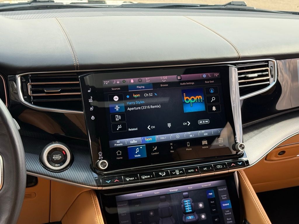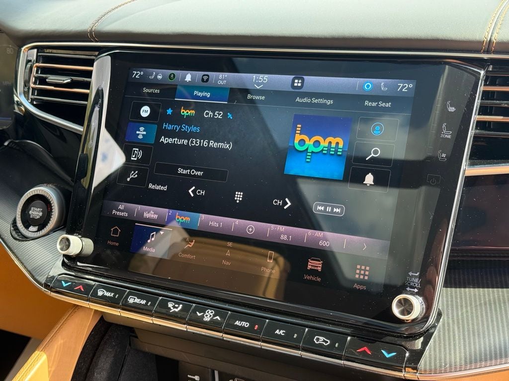 2nd Row Dual Charge-Only USB Ports, 3.92 Rear Axle Ratio, 3rd row seats: bench, 4-Wheel Disc Brakes, 8-Passenger Seating, ABS brakes, Adjustable pedals, Air Conditioning, Alloy wheels, AM/FM radio: SiriusXM with 360L, Amazon Fire TV Built-In, Anti-whiplash front head restraints, Audio memory, Auto High-beam Headlights, Auto-dimming door mirrors, Auto-dimming Rear-View mirror, Auto-leveling suspension, Automatic temperature control, Body Color Roof, Brake assist, Bumpers: body-color, Compass, Delay-off headlights, Driver door bin, Driver vanity mirror, Driver's Seat Mounted Armrest, Dual front impact airbags, Dual front side impact airbags, Electronic Stability Control, Emergency communication system: Automatic SOS Call, Flexible Seating Group, Four wheel independent suspension, Front anti-roll bar, Front Bucket Seats, Front Center Armrest w/Storage, Front dual zone A/C, Front fog lights, Front reading lights, Fully automatic headlights, Garage door transmitter, Genuine wood console insert, Genuine wood dashboard insert, Genuine wood door panel insert, HD Trailer Tow Package, Heads-Up Display, Heated door mirrors, Heated front seats, Heated rear seats, Heated steering wheel, Illuminated entry, Knee airbag, Leather steering wheel, Low tire pressure warning, Memory seat, Navigation System, Night vision lights, Normal Duty Suspension, Occupant sensing airbag, Outside temperature display, Overhead airbag, Overhead console, Panic alarm, Passenger door bin, Passenger seat mounted armrest, Passenger vanity mirror, Pedal memory, Power adjustable front head restraints, Power door mirrors, Power driver seat, Power Liftgate, Power moonroof, Power passenger seat, Power steering, Power windows, Premium Leather Trimmed Bucket Seats, Quick Order Package 23T Obsidian, Radio data system, Radio: Uconnect 5 Nav w/12.0 Display, Rain sensing wipers, Rear air conditioning, Rear anti-roll bar, Rear dual zone A/C, Rear reading lights, Rear seat center armrest, Rear Seat Video Group 1, Rear window defroster, Rear window wiper, Reclining 3rd row seat, Remote keyless entry, Removable Rear Tow Hook, Roof rack, Seatback Video Screens, Security system, Speed control, Speed-sensing steering, Speed-Sensitive Wipers, Split folding rear seat, Steering wheel memory, Steering wheel mounted audio controls, Tachometer, Telescoping steering wheel, Tilt steering wheel, Traction control, Trailer Hitch Zoom, Trip computer, Turn signal indicator mirrors, Two Tone Paint Group, Variably intermittent wipers, Ventilated front seats, Ventilated rear seats, Voltmeter, Wheels: 22 x 9.0 Premium 4 Aluminum, Wheels: 22 x 9.0 Tinted Polished w/Black Insert.